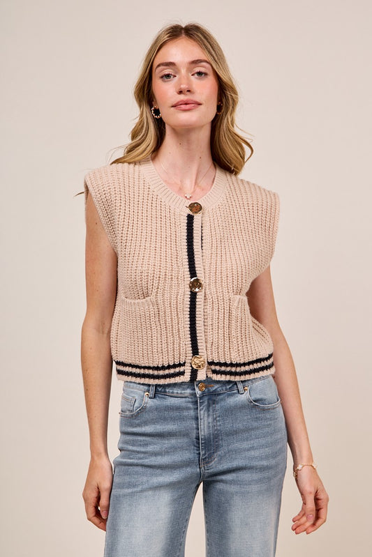 SO ME Big Metal Button Front Stripe Edge Knitted Sweater Vest